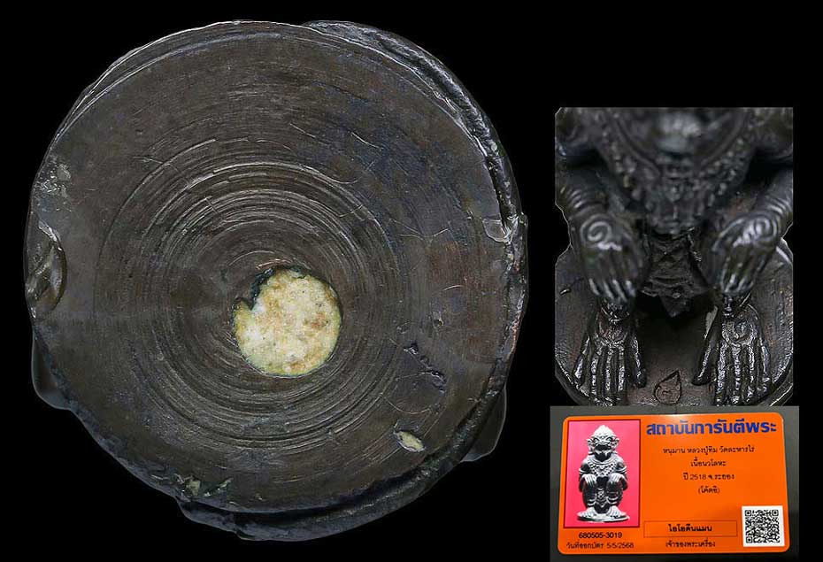 หนุมาน ก้นอุดผงพรายกุมาร หลวงปู่ทิม วัดละหารไร่ ระยอง ปี 2518 เนื้อนวะโลหะ ก้นจารเต็มสูตร |