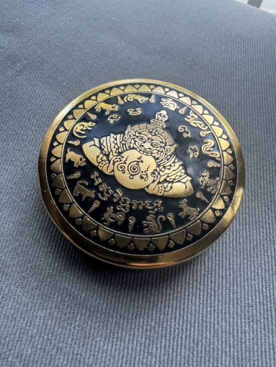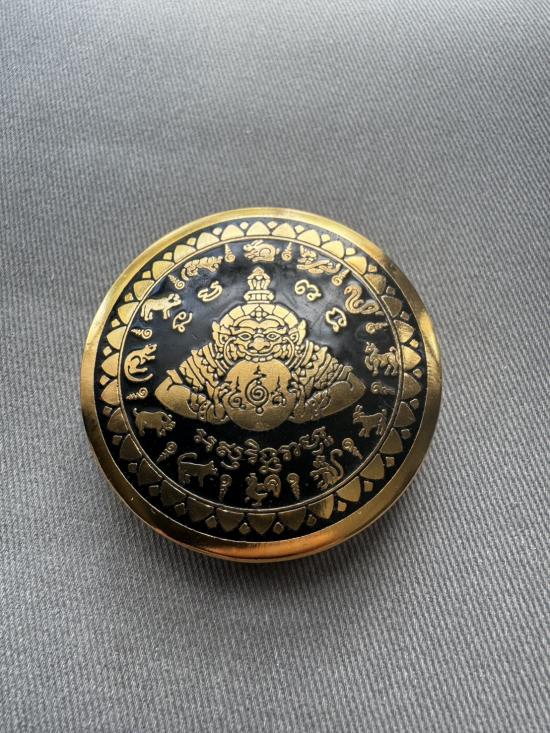 เคาะเดียวไวไว ตลับสีผึ้งพระราหู มหานิยมอุดมโชค จตุคามรามเทพ รุ่น มงคลจักรวาล ปี2549 พิมพ์ใหญ่ ขนาด5.5ซม ลงยาดำ ลงเบญจรงค์น้ำทอง สีผึ้งด้านในเดิมๆ |