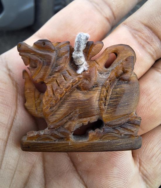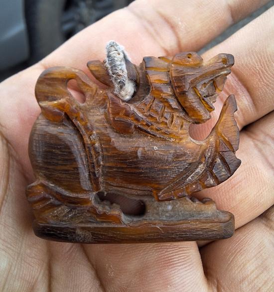 สิงห์ขนาดใหญ่ แกะจากเขา มีรอยจาร เนื้อเก่าๆ |