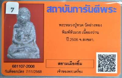พระหลวงปู่ทวด วัดอ่างทอง พิมพ์หัวมวย เนื้อผงว่าน ปี2506 |