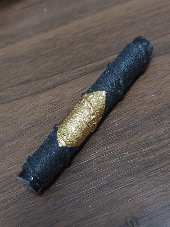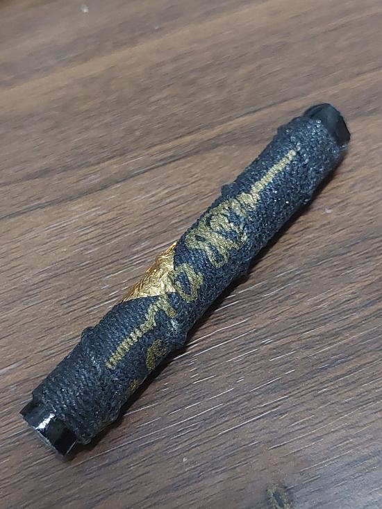 ตะกรุดมหาอุต ถักเชือกจุ่มรักปิดทอง จารหมึกทอง ความยาว ๓ นิ้ว หลวงพ่อตัด วัดชายนา จ.เพชรบุรี ปี ๒๕๔๙