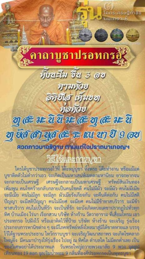 ใครได้บูชาปรอทกรอไว้ที่โต๊ะหมู่บูชา หิ้งพระ โต๊ะทำงาน หรือแม้แต่บูชาติดตัวไม่ต่ำกว่าเอว จะเกิดเป็นมหาเสน่ห์เมตตามหานิยม ยาจกยากจนจะกลายเป็นเศรษฐี เศรษฐีจะกลายเป็นมหาเศรษฐี ทรัพย์สินเงินทองเพิ่มพูน คนโชคร้ายกลับกลายเป็นคนโชคดี จะเป็นที่รัก จะบังเกิดตบะเดชะปรากฎไปทั่วทุกทิศ บ้านเมืองไร่นา เรืองสวน บริษัท ห้างร้าน วัดวาอาราม ที่เสื่อมโทรม เอาปรอทกรอ ไปฝังไว้ หรือเอาติดไว้ที่ป้าย บริษัท ห้างร้าน จะเจริญ รุ่งเรือง ประกอบการพานิชต่างๆ จะมีโภคทรัพย์ หลั่งไหลมาสู่มิได้ขาดหายแล บรรจุไว้ใต้ฐานพระประธาน ไหว้กราบบูชา จะเจริญวัฒนาสถาพร จะเกิดโชคลาภ ใหญ่ยิ่ง มคนมาบำรุงให้รุ่งเรือง ไปอยู่ ณ ทิศใด ตำบลใด ไม่มีตกต่ำเลย เป็นของวิเศษอย่าได้ประมาทแล