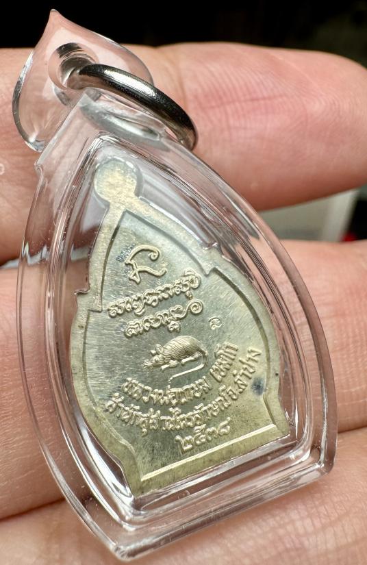 เหรียญใบสาเก ชัยลาภเนื้อเงิน หลังหนู หลวงพ่อเกษม ปี 2538 พร้อมเลี่ยมกรอบสวยๆ |