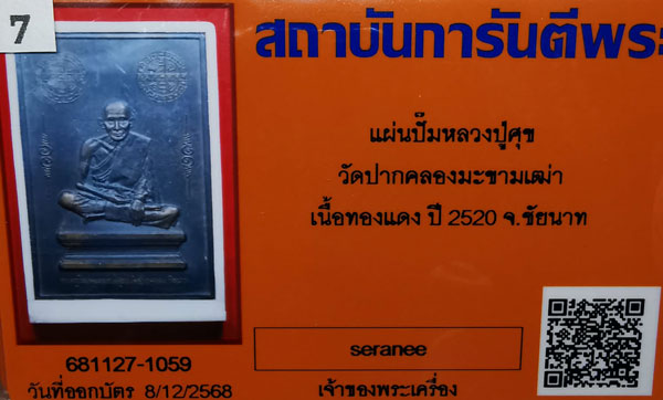แผ่นปั๊มหลวงปู่ศุข วัดปากคลองมะขามเฒ่า เนื้อทองแดง ปี2520 จ.ชัยนาท+ บัตรG-pra สภาพสวยเดิมค่ะ สภาพตามรูปทุกประการค่ะ
