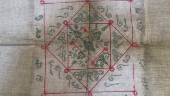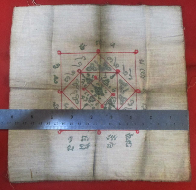 ผ้ายันต์ ไม่ทราบที่ จารยันต์ด้วยมือ เนื้อผ้าดูเก่า ครับ