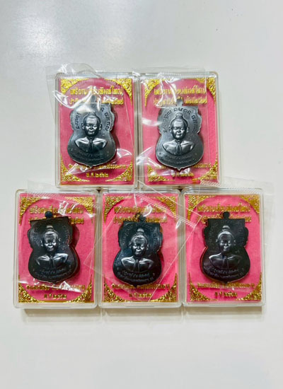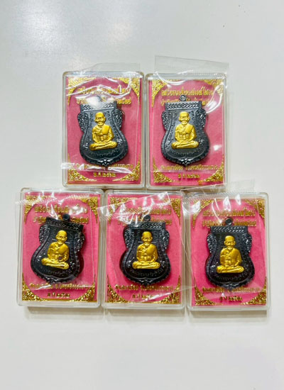 วัดใจ เหรียญเลื่อนพิมพ์ใหญ่ ปาฎิหาริย์ไอ้ไข่ มั่งทรัพย์ วัดเสมาเมือง จ.นครศรีธรรมราช เนื้อทองแดงรมดำหน้ากากทองระฆัง 5 เหรียญ |
