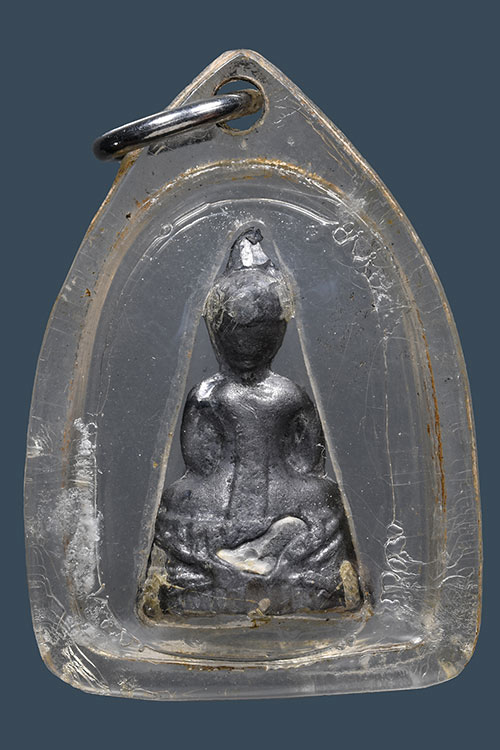พระพุทธฝังเขี้ยวหมาป่า เนื้อชินตะกั่ว หลวงพ่อดำ วัดบางกุฎีทอง เลี่ยมพลาสติกพร้อมใช้ |