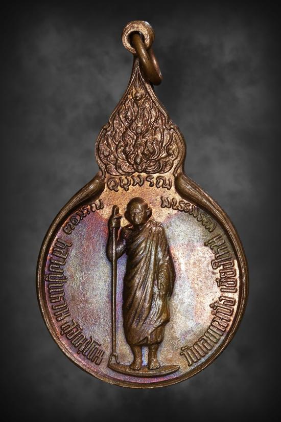 เหรียญยืนหลังพระปรมาภิไธยย่อ ภ.ป.ร. หลวงปู่แหวน สุจิณฺโณ วัดดอยแม่ปั๋ง อ.พร้าว จ.เชียงใหม่ ปี 2519 |