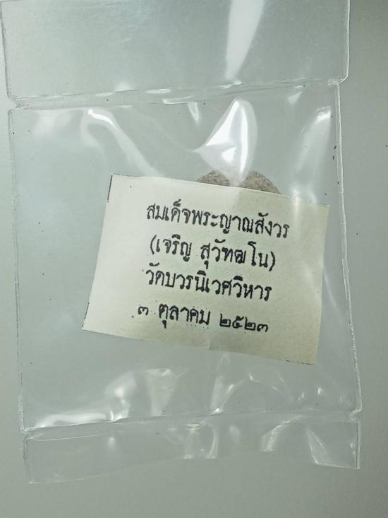 พระในซองพลาสติกซีลเดิมพร้อมใบฝอย พระปิดตายันต์ดวงเล็ก หรือยันต์ดวงสุกิตติมา เนื้อผงทูโทน ด้านหน้าผงเกสร ด้านหลังผงใบลาน สอดตะกรุดเงิน สมเด็จพระญาณสังวร(เจริญ สุวัฑฒโน ปธ.๙) พิธีพุทธาภิเษก ณ พระอุโบสถคณะรังสี วัดบวรนิเวศวิหาร ๒ ตุลาคม ๒๕๒๓ หลวงปู่โต๊ะ วัดประดู่ฉิมพลี ร่วมปลุกเสก สมเด็จพระญาณสังวรฯทรงจุดเทียนชัยและประธานอธิษฐานจิต พร้อมด้วยพระคณาจารย์แห่งยุคอีกหลายรูป ไม่มีกล่อง เคาะเดียว