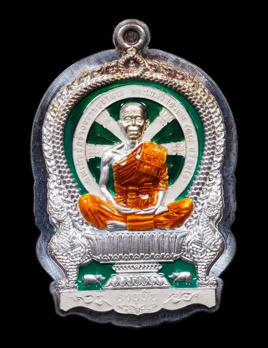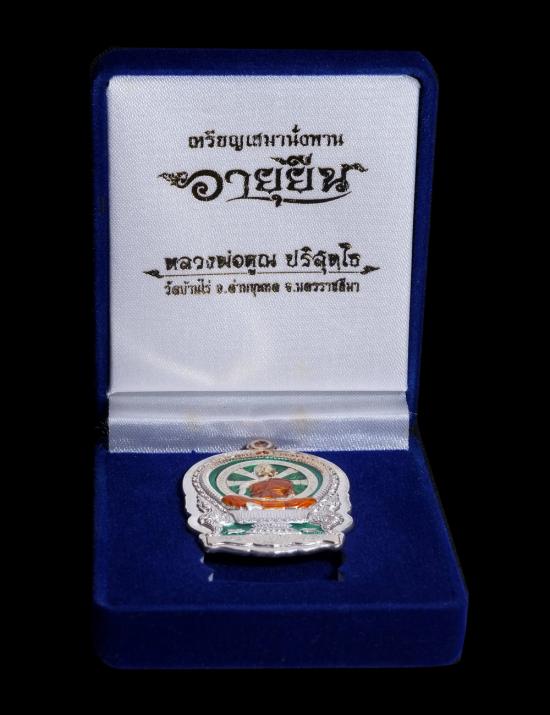 เหรียญนั่งพานอายุยืน (หลังหนุมาน รุ่นแรก) หลวงพ่อคูณ วัดบ้านไร่ เนื้อเงินลงยาไม่ตัดปีก หมายเลข 8 พร้อมกล่อง แดงเคาะแรก