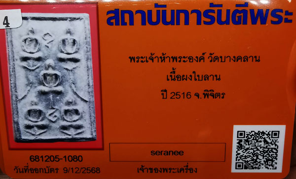 พระเจ้าห้าพระองค์ วัดบางคลาน เนื้อผงใบลาน ปี2516 จ.พิจิตร + บัตรG-pra สภาพเดิมค่ะ |