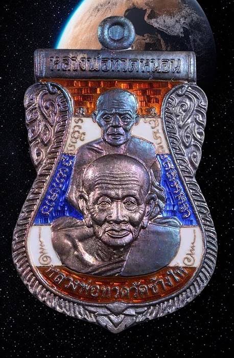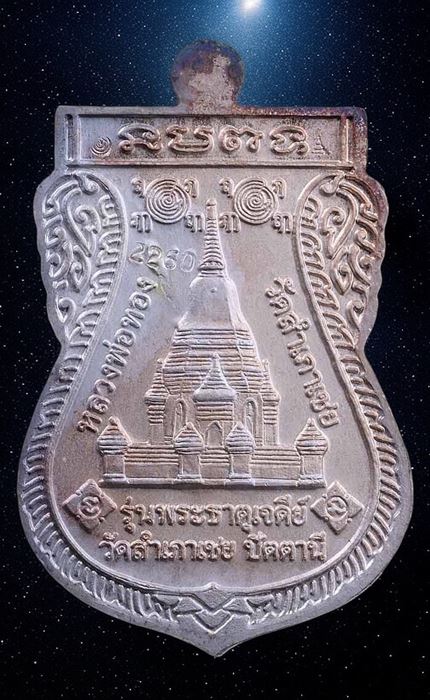 สวยจริงๆ เดิมๆขึ้นรุ้ง เหรียญหลวงปู่ทวด อาจารย์ทอง วัดสำเภาเชย พิมพ์พุทธซ้อน รุ่นพระธาตุเจดีย์ เนื้อเงินลงยาลายธงชาติ ปี 2549 จ.ปัตตานี
