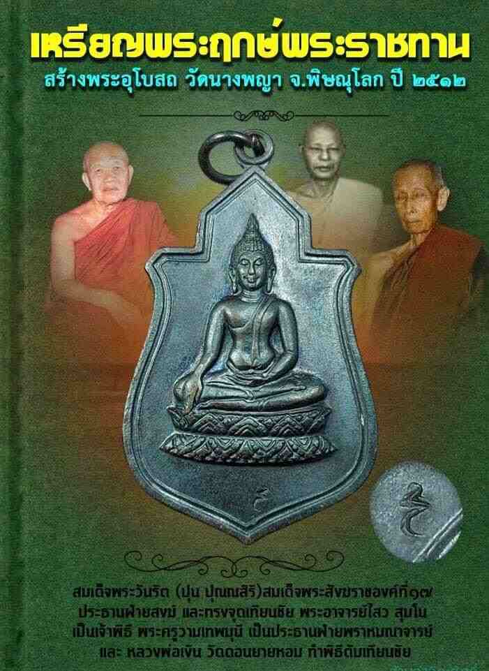 ด้านหลังมีจาฤกว่า " พระบาทสมเด็จพระปรมินทรมหาภูมิพลอดุลยเดช มหิตลาธิเบศรราธิบดี จักรีนฤบดินทร สยามินทรธาธิราช บรมนาถบพิธ พระราชทาน พระฤกษ์สร้างอุโบสถ วัดนางพญา อ.เมือง จ.พิษณุโลก ณ วันพุทธ ที่ 29 มกราคม พุทธศักราช 2512 เวลา 9 นาฬิกา 12 นาที เป็นปฐมฤกษ์ ลัคนาสถิตราศีมีน " เหรียญพระฤกษ์พระราชทานสร้างพระอุโบสถ วัดนางพญา อ.เมือง จ.พิษณุโลก 2512 ทำพิธีจัดสร้างโดย วัดนางพญา จ.พิษณุโลก สมัย พระอาจารย์ถนอม เขมจาโร และพระครูบวรชินวัฒน์ โดยมี สมเด็จพระวันรัต (ปุน ปุณณสิริ) ซึ่งต่อมาได้เป็นสมเด็จพระสังฆราชองค์ที่17แห่งกรุงรัตนโกสินทร์ เป็นประธานฝ่ายสงฆ์ และทรงจุดเทียนชัย พระอาจารย์ไสว สุมโน เป็นเจ้าพิธี พระครูวามเทพมุนี เป็นประธานฝ่ายพราหมณาจารย์ และพลโทสำราญ แพทยกุล แม่ทัพภาคที่3 เป็นประธานฝ่ายฆราวาส และ หลวงพ่อเงิน วัดดอนยายหอม ทำพิธีดับเทียนชัย วัตถุประสงค์ เพื่อจัดหาจตุปัจจัยในการสร้างพระอุโบสถวัดนางพญา โดยเริ่มดำเนินการเมื่อวันพุธที่ 29 มกราคม 2512 เวลา 9 นาฬิกา 12 นาที เป็นปฐมฤกษ์ตามพระฤกษ์สร้างพระอุโบสถที่ได้รับพระราชทานจากพระบาทสมเด็จพระเจ้าอยู่หัวฯ และได้ประกอบพิธีมหาพุทธาภิเษกมหาจักรพรรดิ์ตราธิราชตามจารีตประเพณีโบราณาจารย์ เมื่อวันเสาร์ที่ 30 มกราคม 2514 ในวิหารวัดนางพญา จ.พิษณุโลก พิธีนี้เป็นอภิมหาพิธีพุทธาภิเษกที่ยิ่งใหญ่มากในยุคนั้น โดยนิมนต์ยอดเกจิอาจารย์จากทั่วประเทศ 108 รูป มาร่วมพิธีมหาพุทธาภิเศกอาทิเช่น