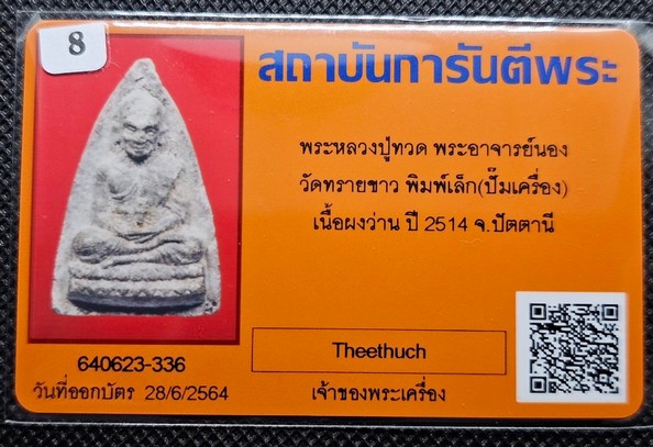 พระหลวงปู่ทวด พระอาจารย์นอง วัดทรายขาว พิมพ์เล็ก ปั๊มเครื่อง เนื้อว่าน ปี 2514 จ.ปัตตานี พร้อมบัตรรับรอง