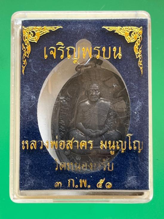 เหรียญเจริญพรบน ปี 2551 หลวงพ่อสาคร วัดหนองกรับ จ.ระยอง เนื้อทองแดงรมดำสวยๆ |