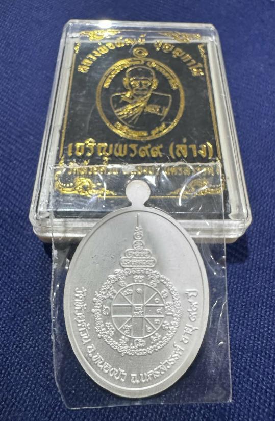 เหรียญเจริญพรล่าง๙๙ หลวงพ่อพัฒน์ วัดห้วยด้วน เนื้อเงินลงยาฟ้า ไม่ผ่านการใช้งาน