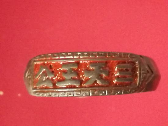 แหวนลงยา อักษรจีน พร้อมกล่องกำมะหนี่ ขนาดไซร์ประมาณ 59-60 ไม่ทราบที่ |
