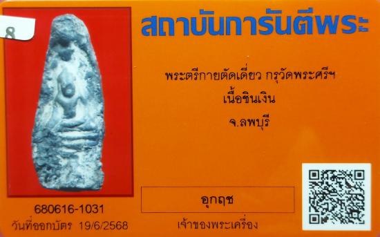 วัดใจ พระตรีกายตัดเดี่ยว กรุวัดพระศรีฯ เนื้อชินเงิน จ.ลพบุรี พร้อมบัตรรับรองจากจีพระ |