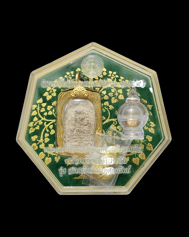 พระสมเด็จวัดระฆังย้อนยุคผสมมวลสารเก่า + ขี้ผึ้งเทียนชัย + หน้ากากทองเหลืองสมเด็จโต รุ่น อริยทรัพย์และกุศลทรัพย์ ปี 57 |