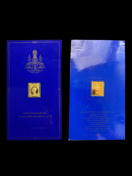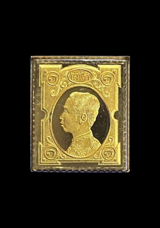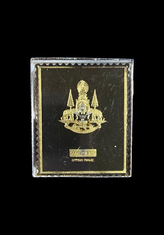 เหรียญแสตมป์ในหลวง ร.9 เนื้อเงินบริสุทธิ์ ชุบทองคำสวิส 999.9 สร้างที่ระลึกในงานฉลองศิริราชสมบัติครบ 50 ปี สร้างปี 39 ผลิตที่ประเทศสวิตเซอร์แลนด์ ชนิดอด 20 บาท (นิยม) |