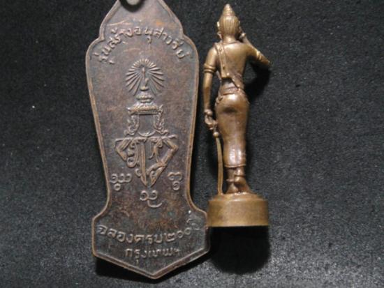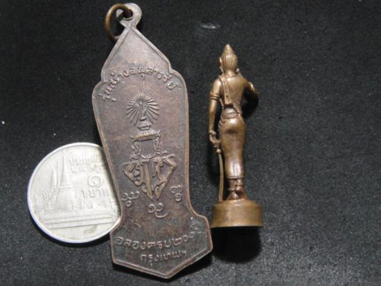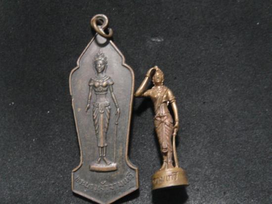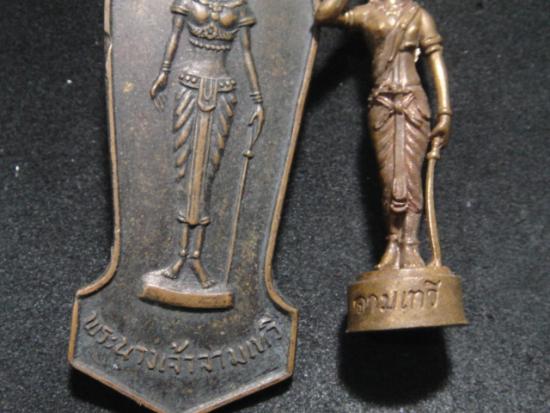 วัดใจเคาะเดียว.........100.......เหรียญพระนางเจ้าจามเทวี รุ่นสร้างอนุสาวรีย์ฉลอง 200 ปีกรุงเทพฯ ปี 2525 สวย + รูปหล่อยืน รวม 2 องค์ |