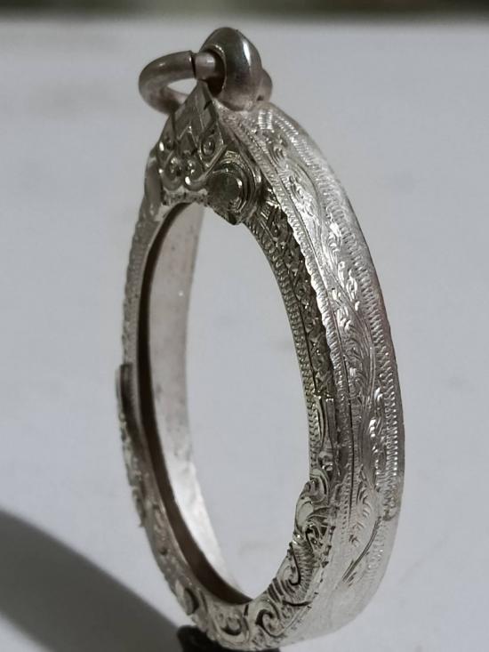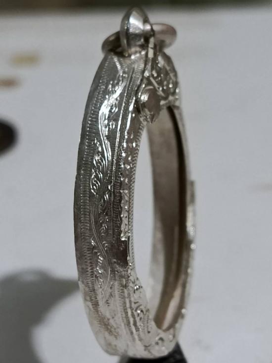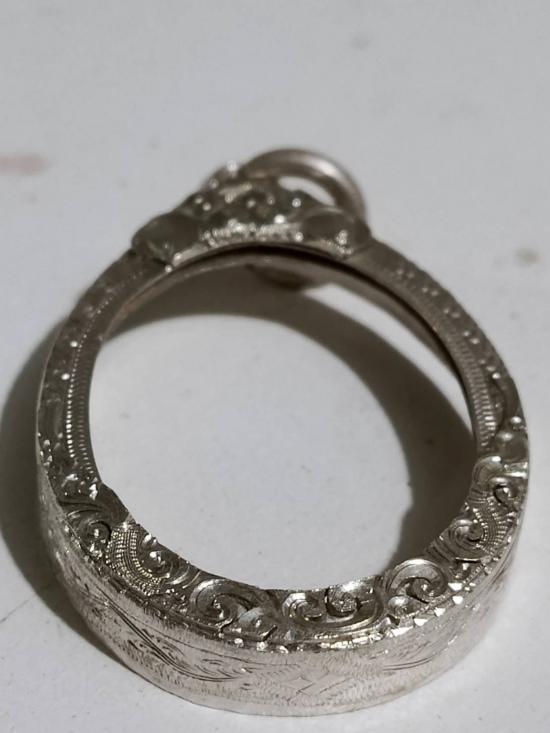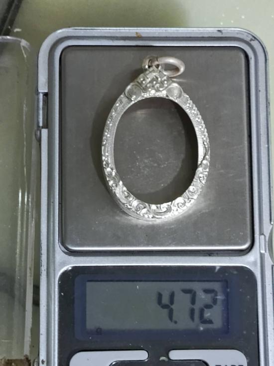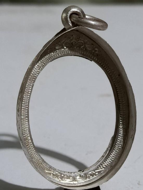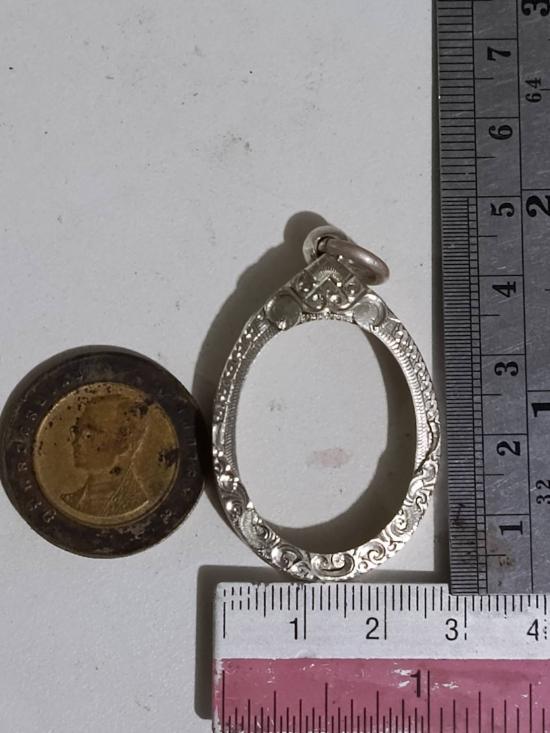 กรอบเงินแท้ เงินเต็มสั่งตัดมา 1000 ใส่เหรียญรูปไข่ ลป.ทวด สวยหนา หัวสิงห์กนกใหญ่ สมบูรณ์หนัก 4.72 กรัม |
