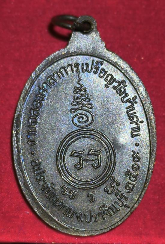 ด้านหลังเหรียญตรงกลางเป็นยันต์ ด้านบนบริเวณขอบ มีตัวอักษรจารึกคำว่า งานฉลองศาลาการเปรียญวัดบ้านด่าน ส่วนด้านล่างของเหรียญจารึกว่า อ.ประจันตคาม จ.ปราจีนบุรี ๒๕๑๙