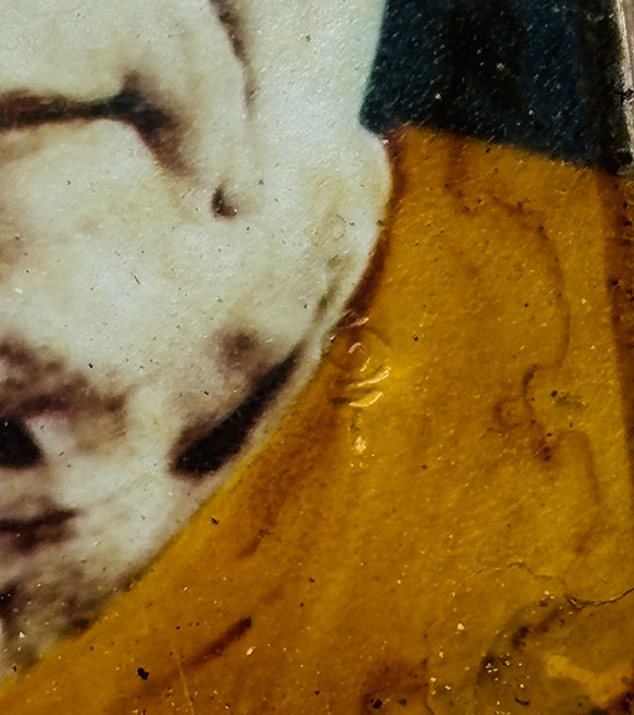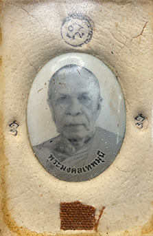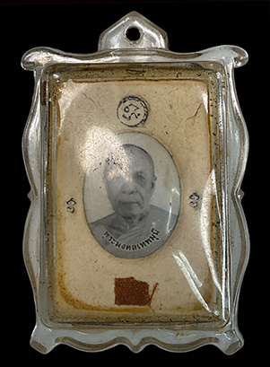 ล็อกเก็ตรูปหลวงพ่อสด วัดปากน้ำ ด้านหน้าตอกโค๊ต หลังฝังล็อคเก็ต จีวรและยันต์ |