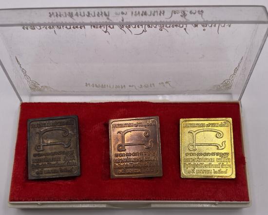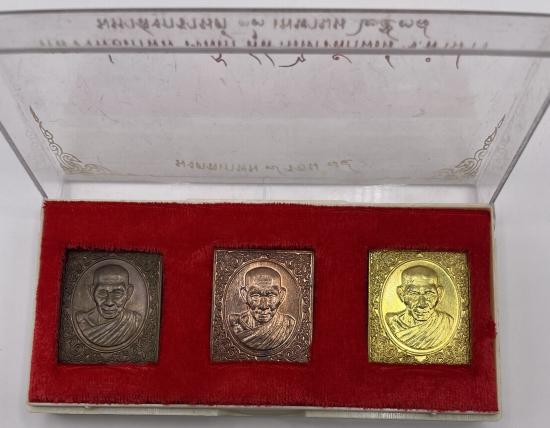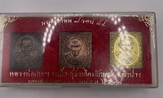เคาะเดียวแดง เหรียญแสตมป์ รุ่น มงคลเกษม7รอบ ปี 38 ประกอบด้วย เนื้อนวะโลหะ เนื้อทองเหลือง และเนื้อทองแดง พร้อมกล่อง (2) |