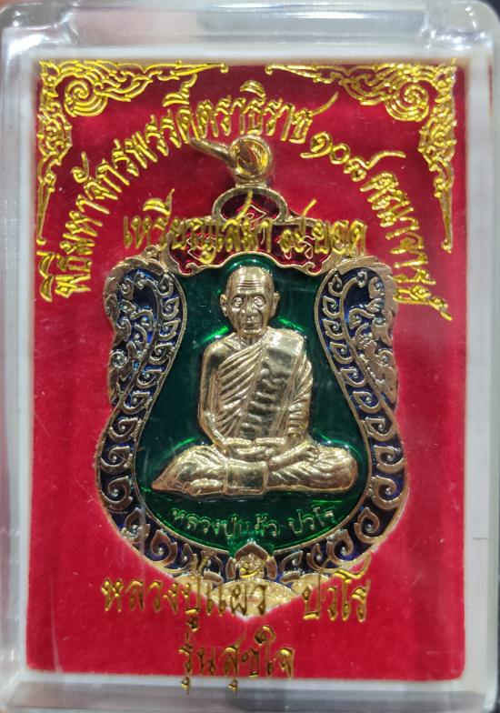 เหรียญเสมาสุขใจ ปี 2550 เนื้อกะไหล่ทองลงยาน้ำเงิน เลข522 หลวงปู่แผ้ว ปวโร |