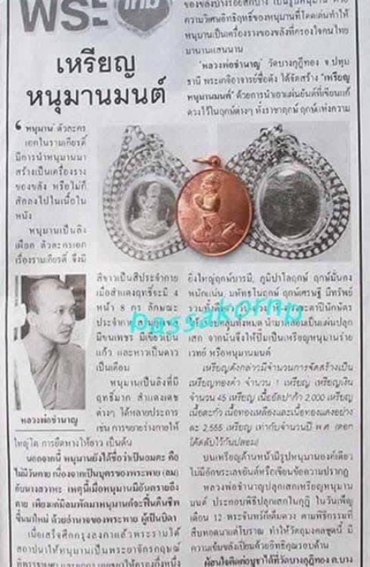 เหรียญหนุมานร่ายเวทย์ (หนุมานมนต์) เนื้ออัลปาก้า หลวงพ่อชำนาญ วัดบางกุฎีทอง ปี 2555 |