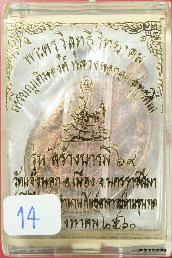 เหรียญหลวงพ่อทอง รุ่นสร้างบารมี ปี2560 เนื้อนวะตอก๙รอบ หมายเลข 14 |