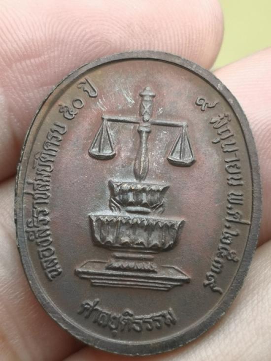 เหรียญในหลวง ฉลองสิริราชสมบัติครบ 50 ปี ศาลยุติธรรม พ.ศ. 2539 เนื้อทองแดงรมดำ สภาพตามรูป ราคาเบาๆ |