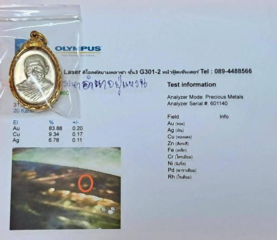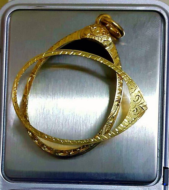 กรอบทองคำแท้ ทรงเหรียญรูปไข่ ยกซุ้มหัวสิงห์ น้ำหนักประมาณ 5.9 กรัม เปอร์เซ็นสูง 83.88% |
