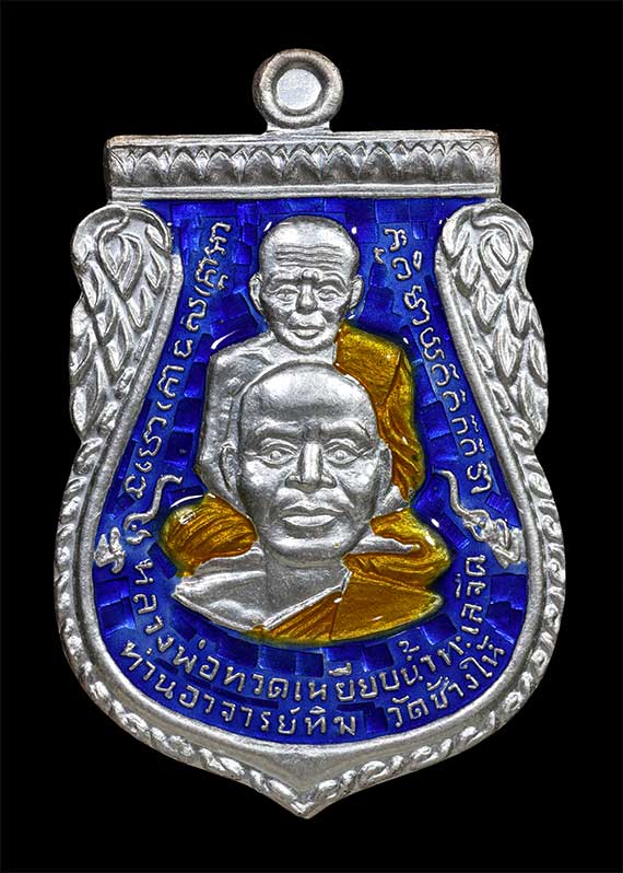 หลวงพ่อทวด หลวงพ่อทอง วัดสำเภาเชย รุ่นแซยิด 93 เหรียญพุทธซ้อน พิมพ์กรรมการใหญ่ เนื้อเงินลงยา พื้นน้ำเงิน จีวรเหลือง