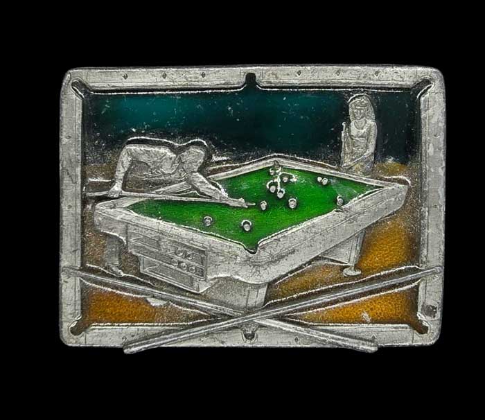 หัวเข็มขัดนี้มีธีมโต๊ะบิลเลียดและทำจากโลหะสีเงิน |