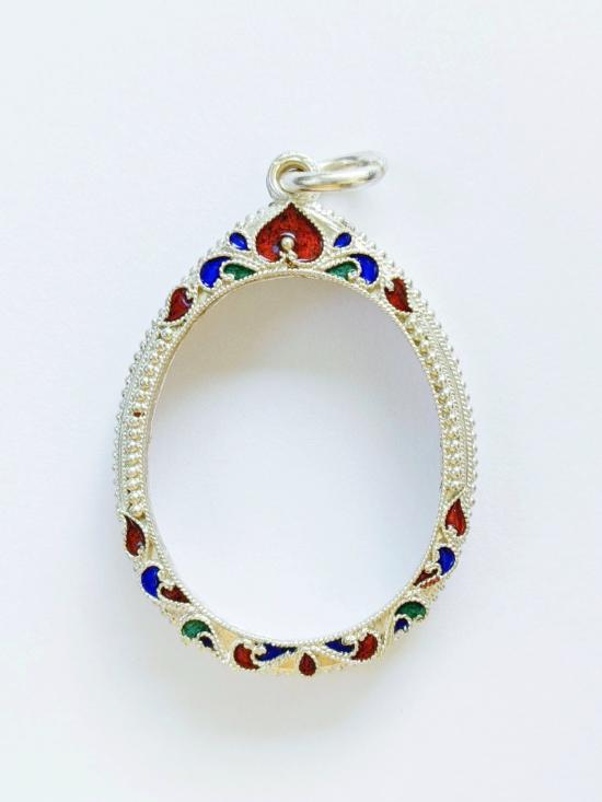 กรอบเงิน ลงยาสุโขทัย ใส่ เหรียญรุ่นแรก หลวงปู่แผ้ว วัดกำแพงแสน ขนาดตามภาพ ซื้อมาเก็บไว้ยังไม่ได้ใช้งานค่ะ |