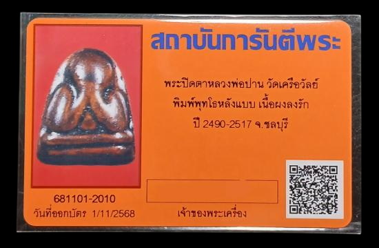 พระปิดตา หลวงพ่อปาน วัดเครือวัลย์ ชลบุรี พิมพ์พุทโธหลังแบบ เนื้อผงลงรัก ปี 2490-2517 จ.ชลบุรี สวยๆ พร้อมบัตร