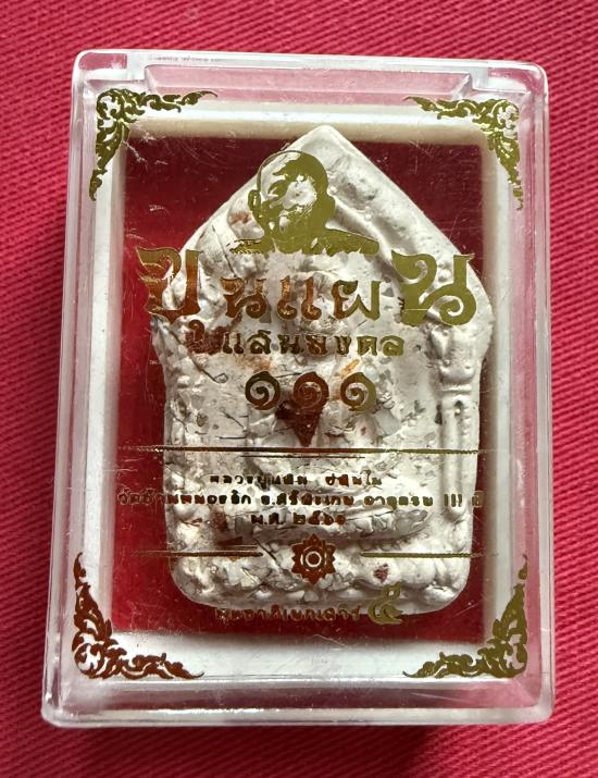 วัดใจไปเลย ขุนแผนแสนมงคล 111 ปี หลวงปู่แสน วัดบ้านหนองจิก จ.ศรีษะเกษ ปี 2561 เนื้อผงโรยเกศา พระธาตุ หลังฝังหน้ากากหมายเลข 129 |