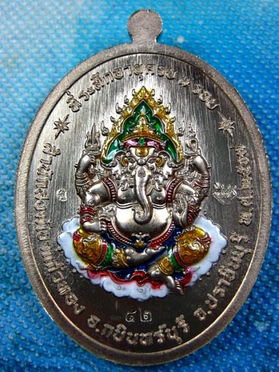 เหรียญรุ่นประทานพร เนื้ออัลปาก้าลงยาพื้นเขียว ลงยาประทานพรขอบ ลงยาจีวร หลังลงยาเครื่องทรง พระพิฆเนศ หลวงปู่บุญมา โชติธมโม สำนักสงฆ์เขาแก้วทอง (---A81---) |