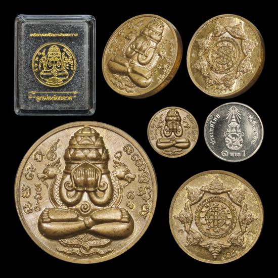 เหรียญพระปิดตาพังพระกาฬ รุ่น "ลูกพ่อต้องรวย" เนื้อชนวน โค๊ตพิเศษ แยกชุดทองคำ พิมพ์เล็ก หมายเลข ๕๑๘๔ พร้อมกล่องเดิม สุดยอดมหาพิธีเทวาภิเษก ๔ วาระ จัดสร้างโดย หมึก ท่าพระจันทร์ |