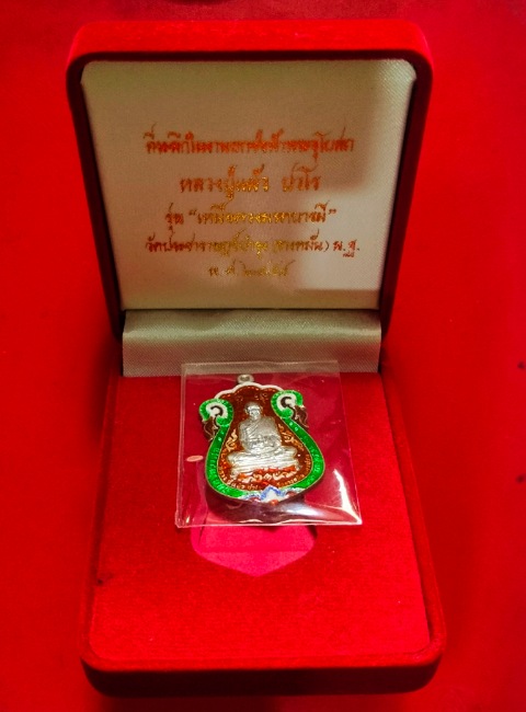 เหรียญเสมาเงินลงยา หลวงปู่แผ้ว วัดรางหมัน พร้อมกล่อง รุ่นเหนือดวงมหาบารมี เลข 53 ปี 2554