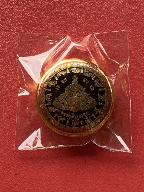 เคาะเดียวแดง สีผึ้งพระราหู รุ่น มงคลจักรวาล เนื้อ โลหะชุบทองลงยาดำขอบแดง ขนาด3.2ซม |