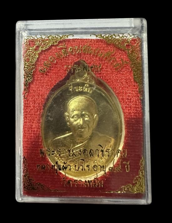 เหรียญฉลองเลื่อนสมณศักดิ์ หลวงปู่แผ้ว ปวโร วัดรางหมัน นครปฐม อายุ ๙๙ ปี เลข ๒๓๒๔ พร้อมกล่องเดิม เนื้อฝาบาตร |