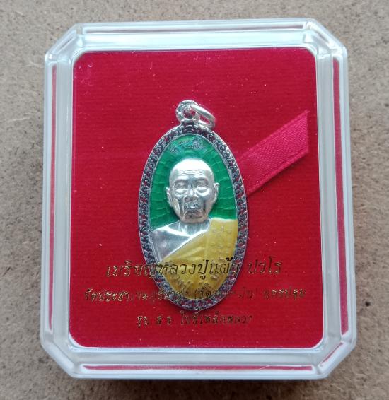 เหรียญใบขี้เหล็กหลัง สธ. เนื้อเงินลงยา หลวงปู่แผ้ว วัดรางหมัน อ.กำแพงแสน จ.นครปฐม ปี2556 หมายเลข1146 พร้อมกล่อง ตามรูป