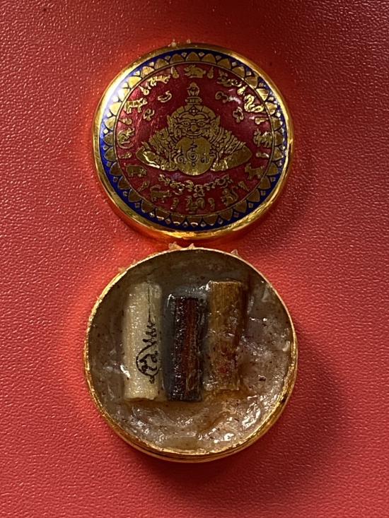เคาะเดียวแดง สีผึ้งพระราหู รุ่น มงคลจักรวาล เนื้อ โลหะชุบทองลงยาสีแดงขอบสีนำ้เงิน ขนาด3.2ซม |