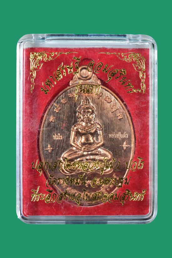 วัดใจ เหรียญมหาเศรษฐีจอมสุรินทร์ รุ่นแรก หลวงปู่แผ้ว ปวโร วัดรางหมัน ปี 2562 เนื้อทองแดงผิวไฟ สภาพสวย กล่องเดิมๆ |