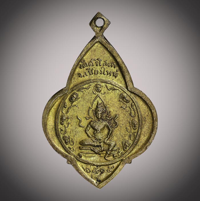 (วัดใจ)เหรียญทรงดอกจิกครูบาศรีวิชัย ลักษณะของครูบาฯ ยืนถือไม้เท้า ส่วนด้านหลังเหรียญเป็นรูปพระสยามเทวาธิราช วัดศรีโสดา จ.เชียงใหม่ สร้างปี 2515 เนื้อทองฝาบาตร |