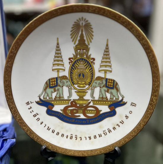 จานโชว์สัญลักษณ์ สิริราชสมบัติครบ 50 ปี ในหลวงรัชกาลที่ 9 ปี พ.ศ. 2539 ช่วงนี้เป็นช่วงเวลาที่เหมาะสมที่จะซื้อสะสมหรือให้ผู้ใหญ่ซึ่งเป็นสิ่งที่มีคุณค่า ราคาเบา ๆ เชิญครับ |