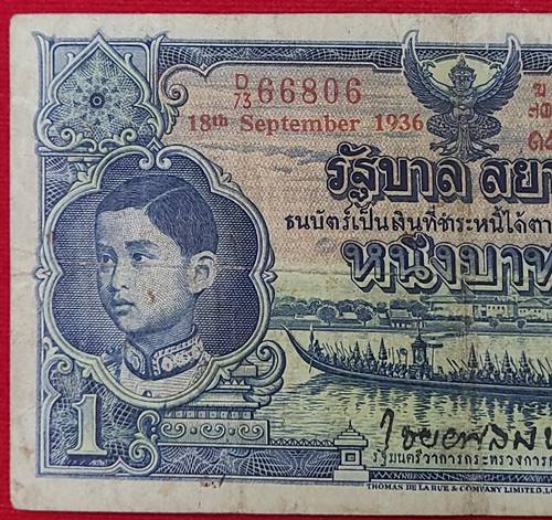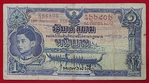 ธนบัตร 1บาท โทมัส รัชกาลที่ 8 หมายเลข 73D 66806 - ๗๓ฆ ๖๖๘๐๖ ลายเซ็น พระยา ไชยยศสมบัติ พิมพ์เมื่อ วันที่ 18 กันยายน 2479 |